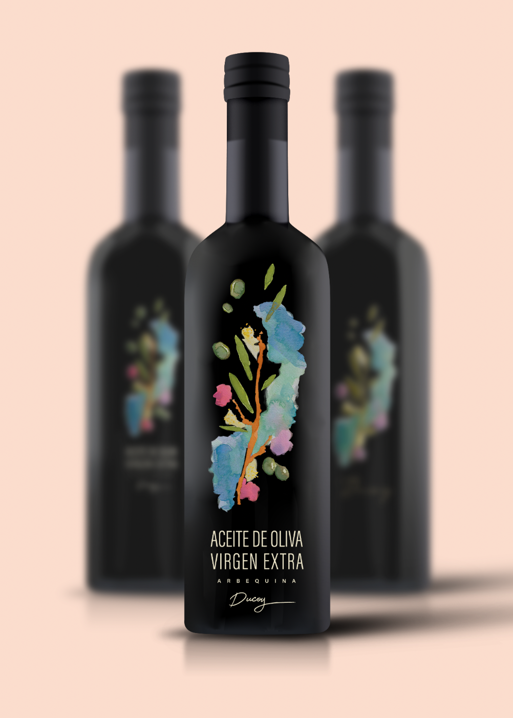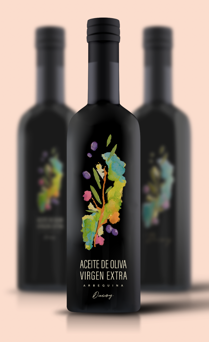 La idea del cliente era tener contraste con un fondo oscuro, que favorece la conservación del aceite, protegiéndolo de los rayos solares, y que además aporta un toque de elegancia que le conviene a la marca, contando con su público objetivo.